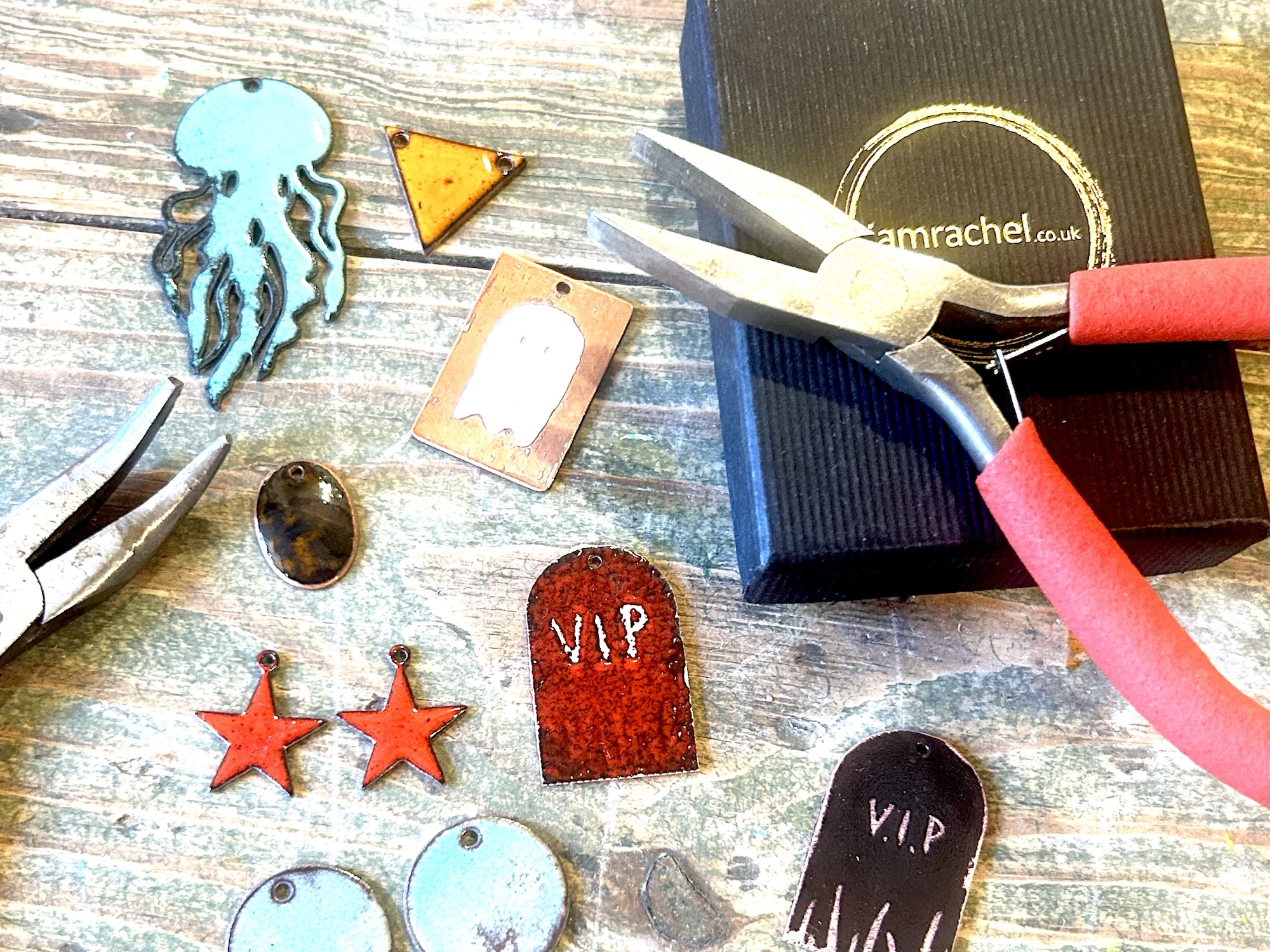 - All pieces are backed with counter enamel so the copper does not touch the skin