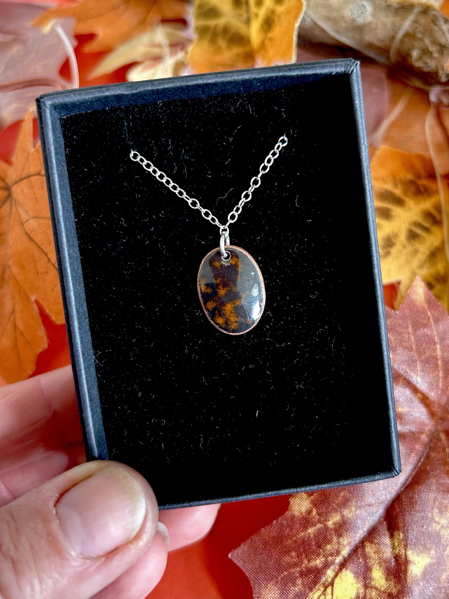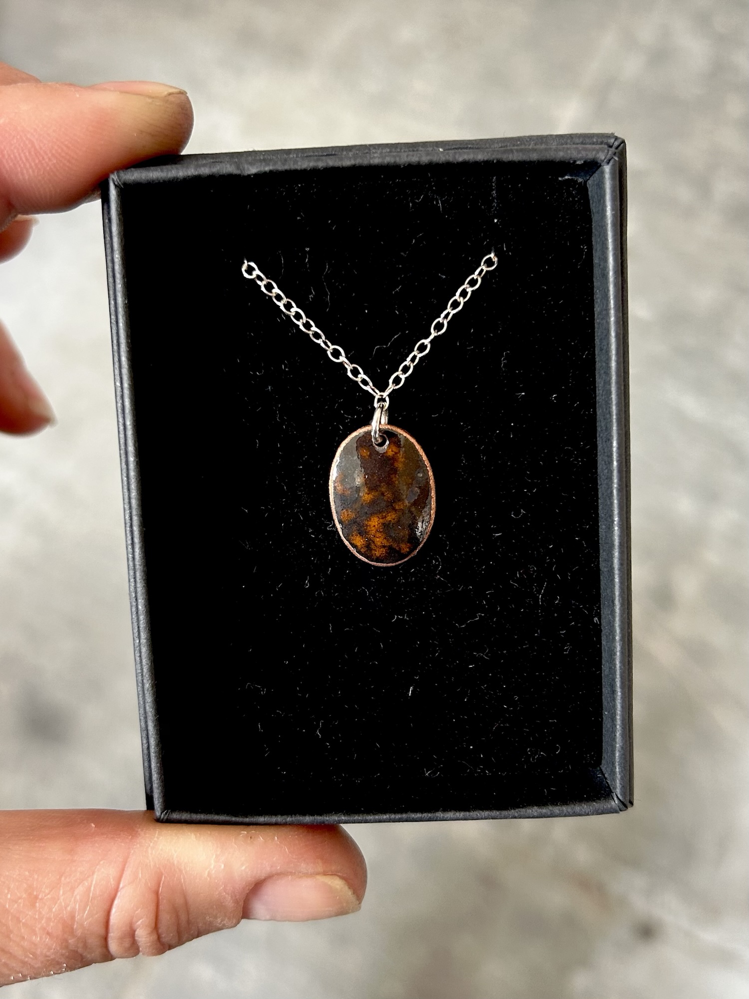 Autumnal disc pendant enamelled in orange which has burnt out to black to create this tortoise shell effect