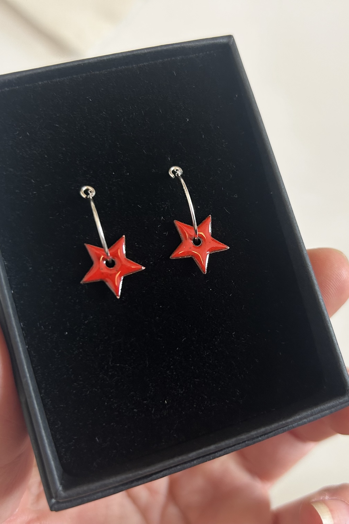 - Red star earrings on silver hoops with a surprise colour on the reverse