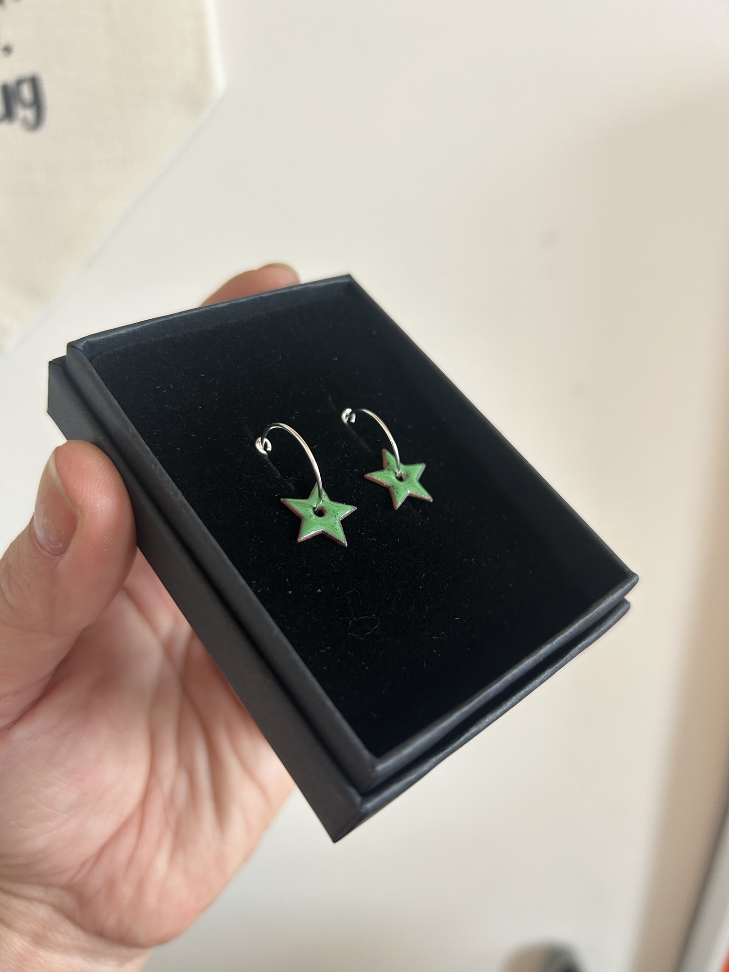Dainty enamel star earrings on easy to fasten sterling silver hoops