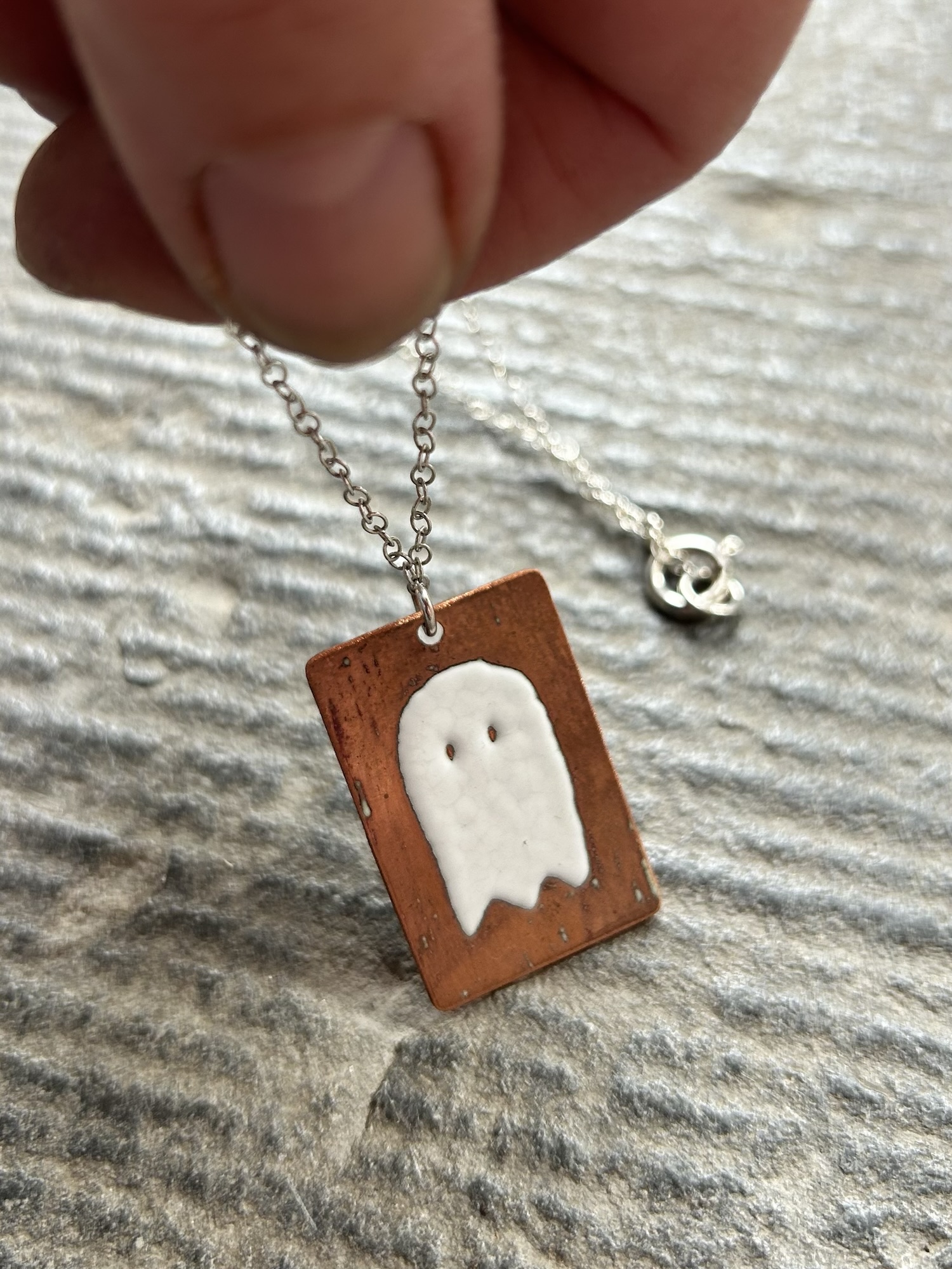 - Made by painting liquid enamel onto copper and sgraffito scratching to draw the ghost image
