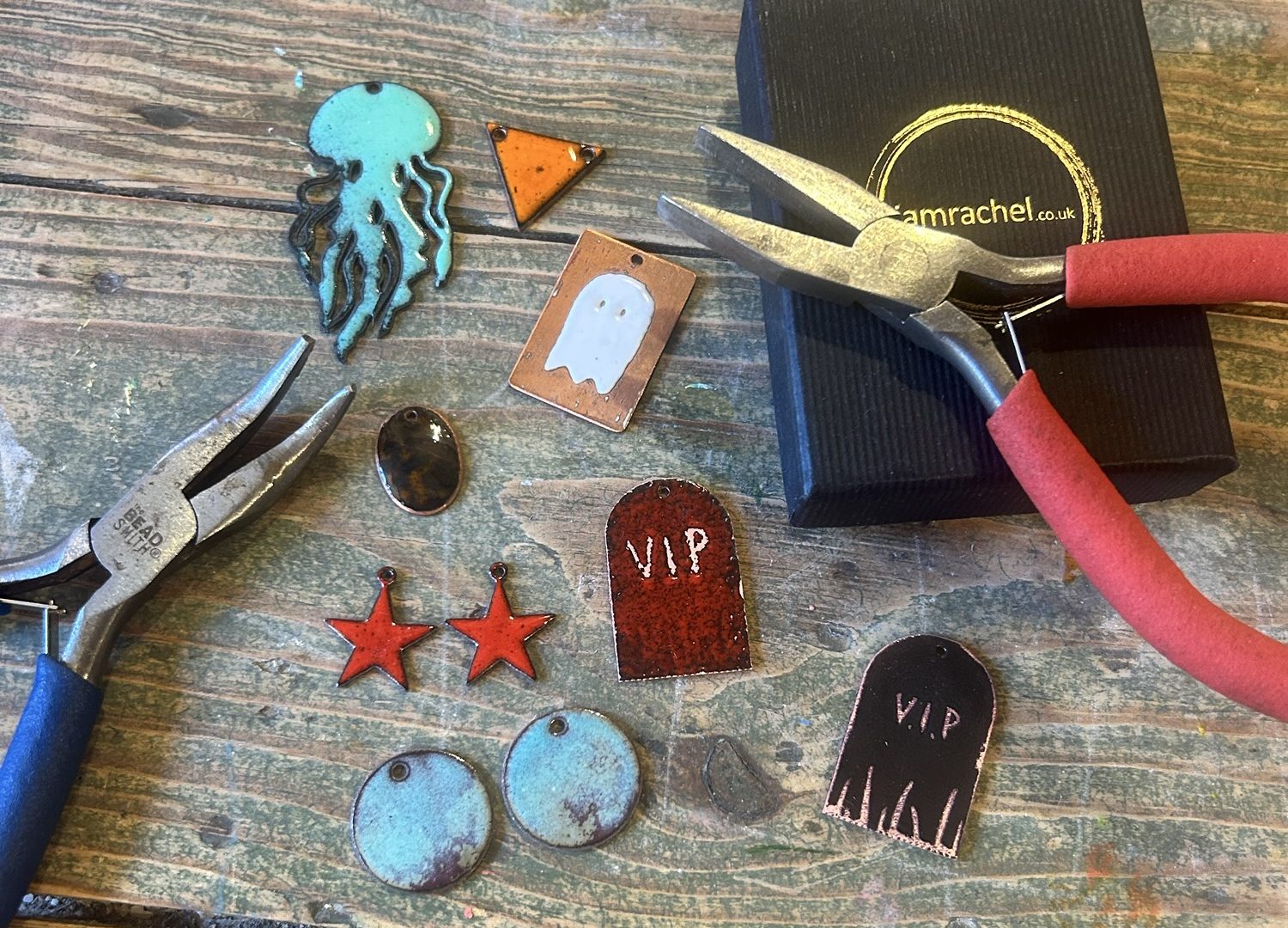 - All pieces are backed with counter enamel so the copper does not touch the skin