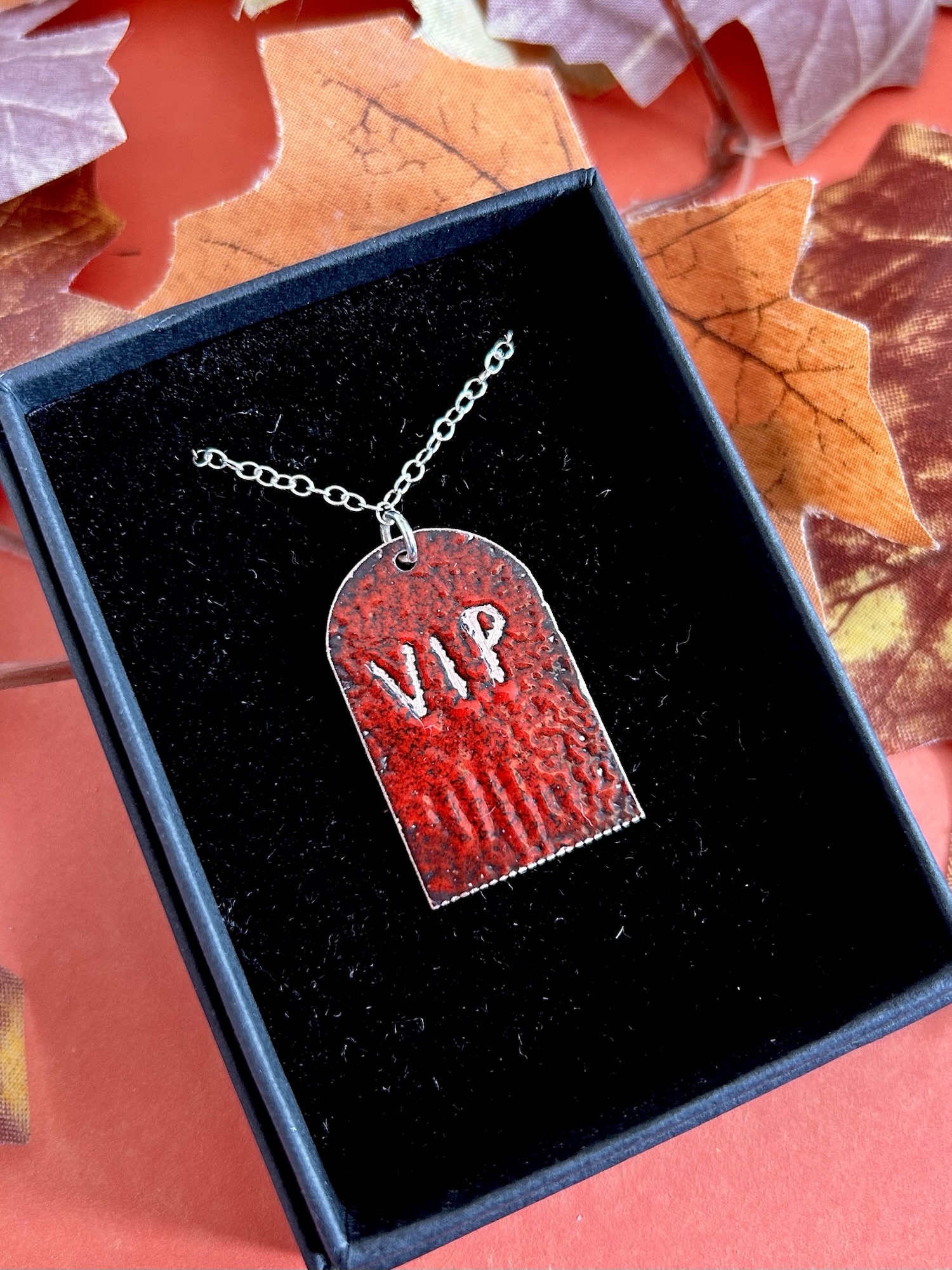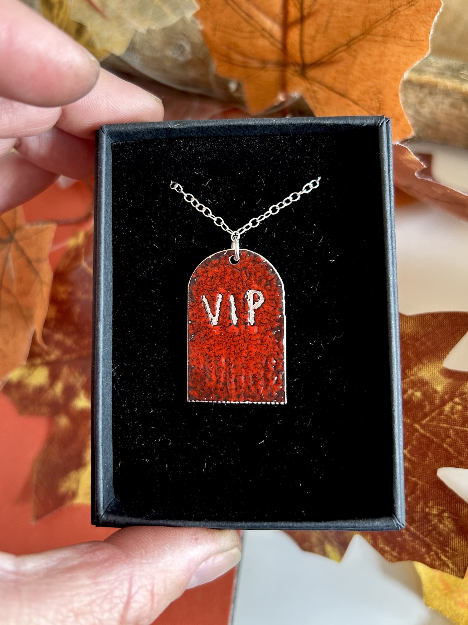 Available in red or black, one of a kind enamel V.I.P pendant with sterling silver chain